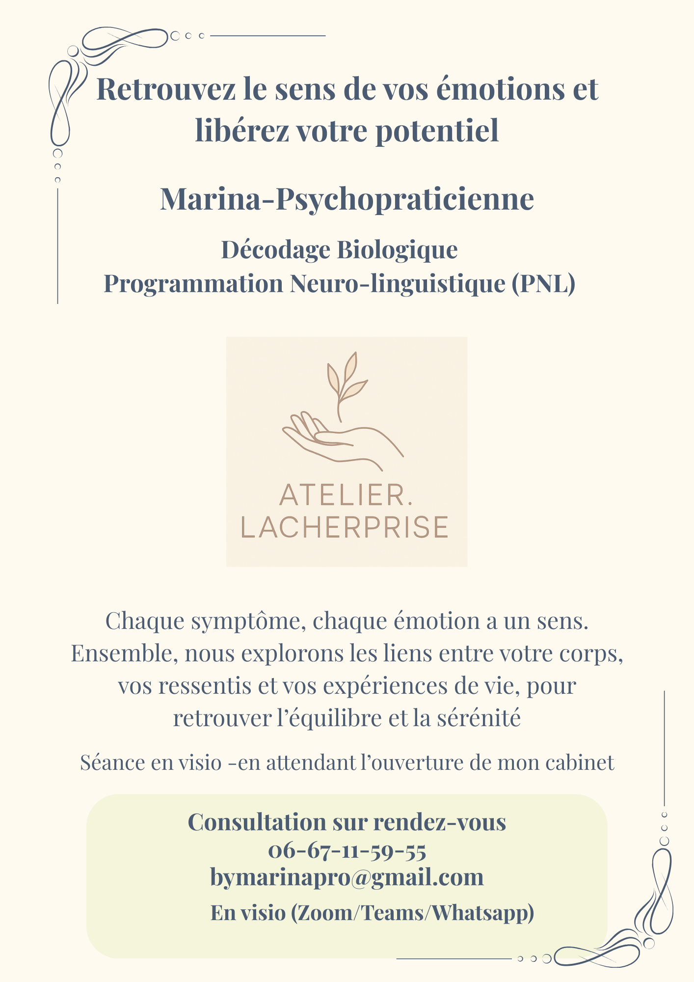Je suis Marina, psychopraticienne spécialisée en décodage biologique et en PNL (programmation neuro-linguistique).